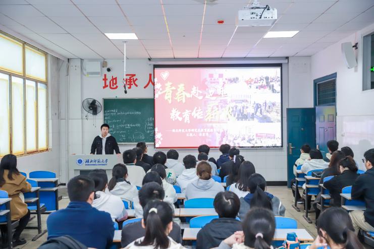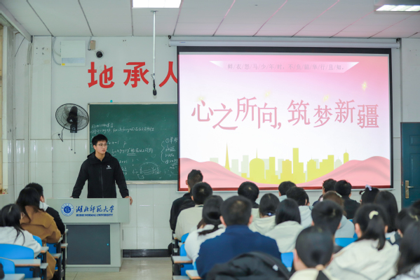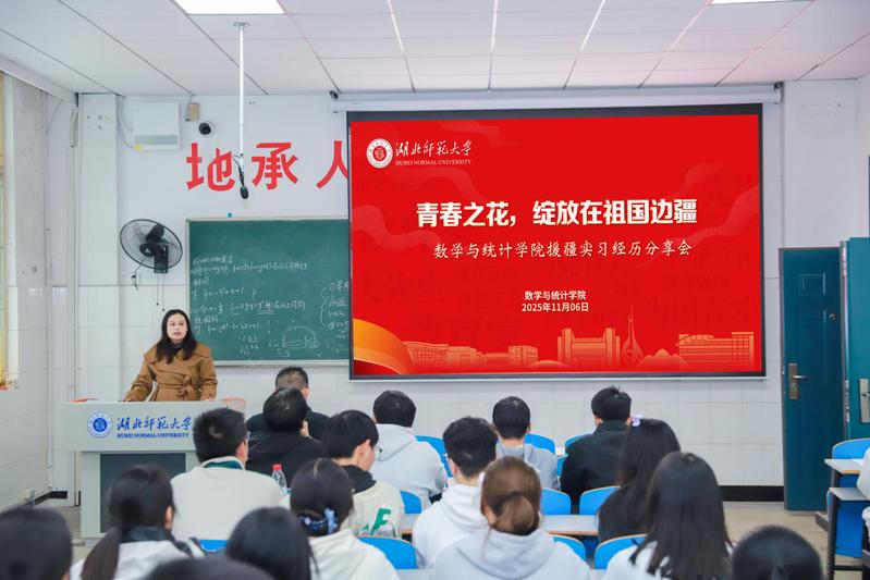 青春赴边疆,教育传薪火。2025年11月6日下午14:30,湖北师范大学数学与统计学院在科技大楼9300教室,举办了一场以“青春之花绽放在祖国边疆”为主题的援疆实习经验分享会。本次活动由数统学院苏梦月老师主持,学院部分师生代表到场聆听,共同感受援疆学子们的青春担当。