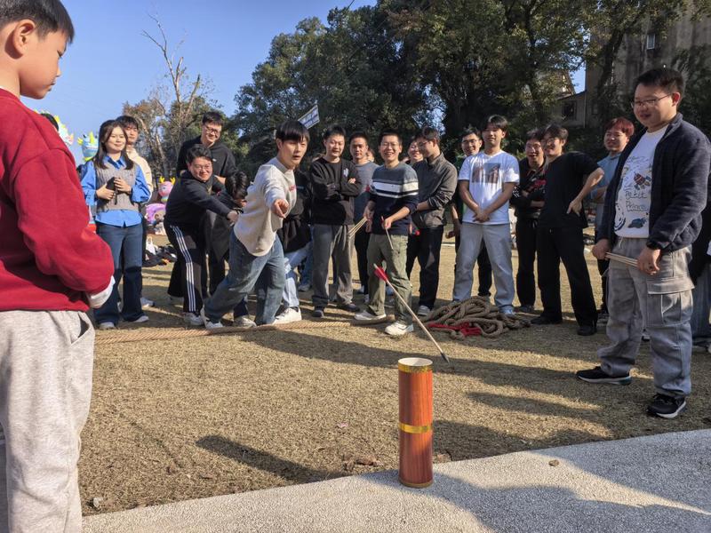 在接力竞走项目中,选手们需保持双脚不同时离地、前腿触地不屈膝的规范姿势,完成接力任务。每位队员既小心翼翼又步伐坚定,场外队友的加油声此起彼伏。迎面接力赛场上,队员们全力冲刺,每一次交接都凝聚着团队的默契,辅导员黄新望,陈菲也热情参与进去。拔河比赛更是将现场气氛推向高潮,各支队伍紧握长绳、齐心协力,展现了顽强拼搏的团队精神。随后,研究生们还与附近的老年人进行了一场友谊拔河赛,双方在欢声笑语中交流互动,增进了不同年龄层之间的深厚情谊。投壶项目则考验着选手的专注力与稳定性,大家屏气凝神、精准投掷,每一次成功的投掷都引发观众的阵阵喝彩。本次运动会采用积分制累计得分,最后,一组凭借17分荣登榜首,二组以15分获得第二名,四组、五组以10分共同荣获第三名。