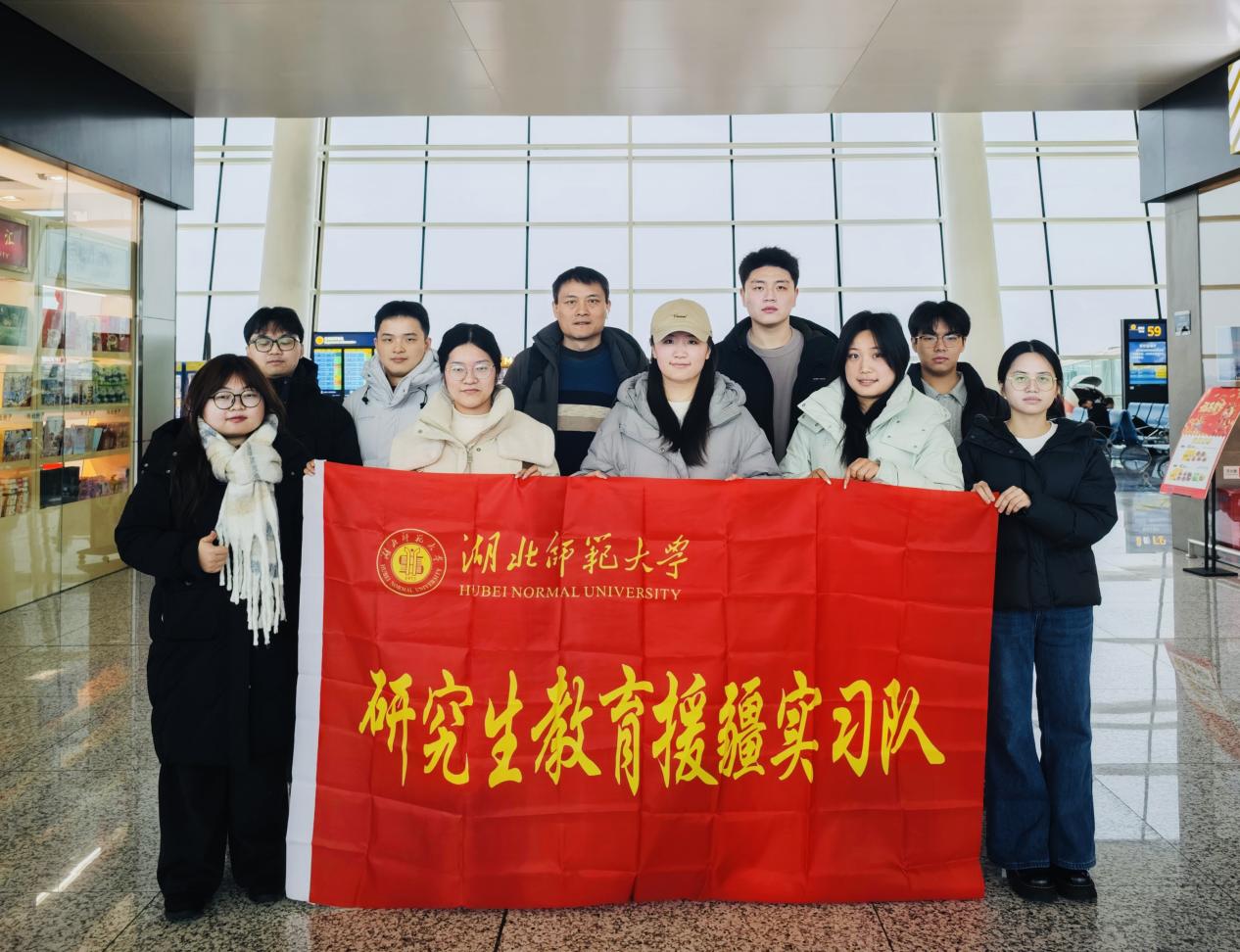 出征当日,实习队全体成员在学校统一组织下于机场集结合影,鲜红的 “湖北师范大学研究生教育援疆实习队” 队旗迎风招展,映照出队员们奔赴边疆、服务教育的坚定信念。从长江之畔到西北边陲,跨越数千公里的行程中,队员们始终怀揣对教育事业的赤诚与对援疆工作的敬畏,带着学校的殷切嘱托与期望,踏上了这场以爱为帆、以育为任的边疆育人之旅。