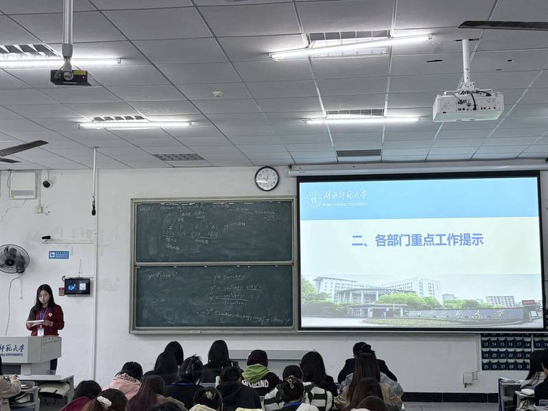 在工作部署环节,实践部、文体部和国际交流部部长依次汇报近期工作进展,并明确下一阶段任务。实践部部长明雨重点介绍了素质活动拓展活动的情况,并预告了2026年寒假实践活动;文体部部长荣艺卓汇报近期体育节文化活动比赛进度与成绩情况;主席团成员谭莉肯定各部门工作成效,强调体育文化节安全保障工作,要求加强学术部活动宣传力度。